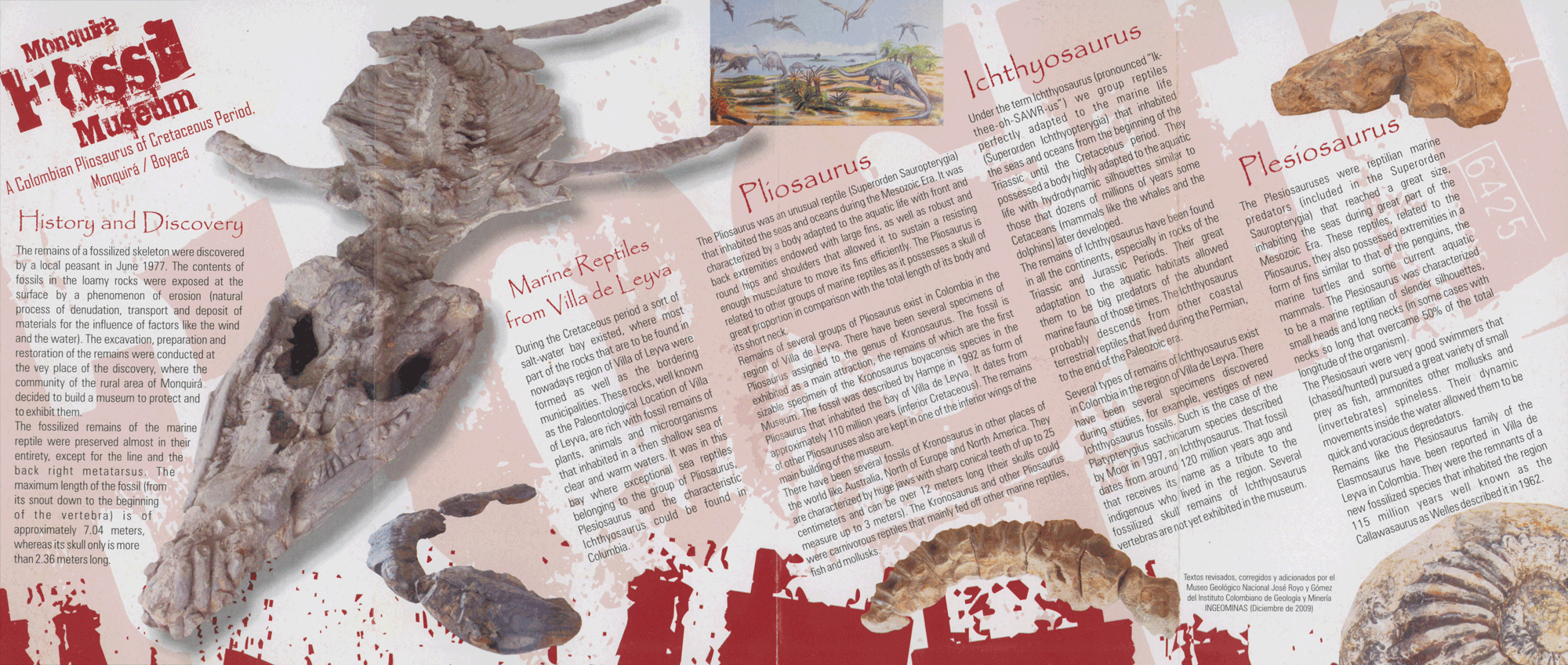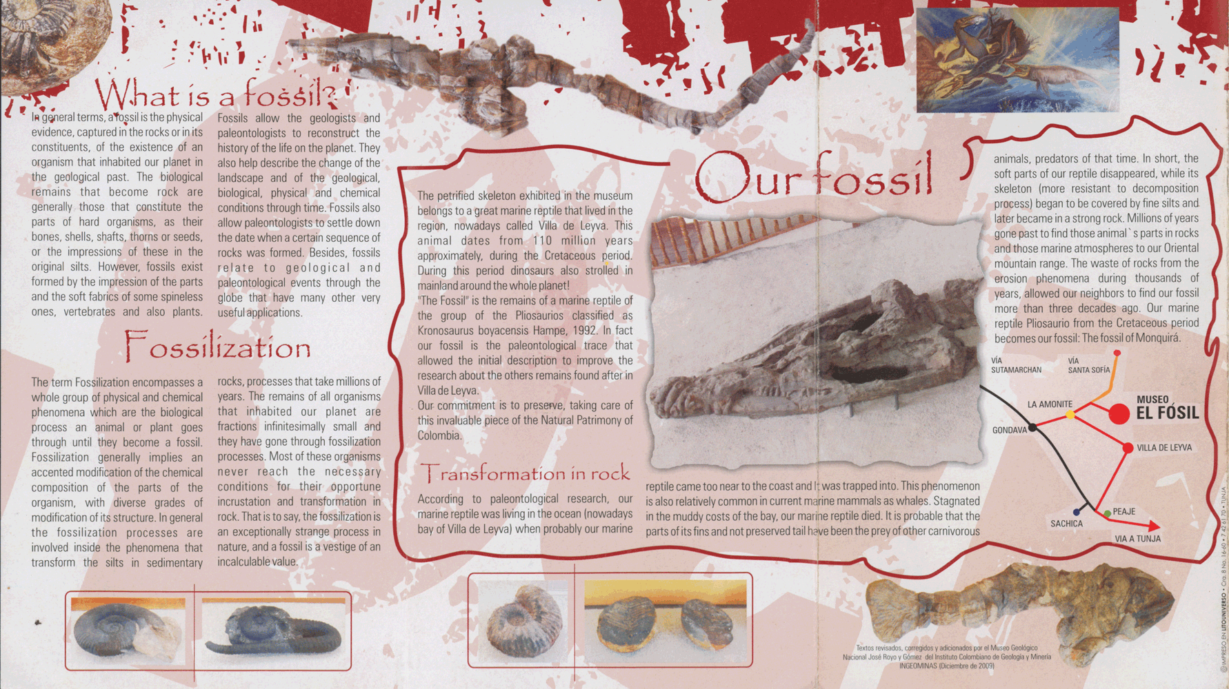Nach den ersten 2 Km treffe ich ein Paar aus Freiburg, das sogar mit dem großen Gepäck unterwegs ist. Einen weiteren Km später gesellt sich noch eine arbeitslose Italienerin zu uns. Nach insgesamt 6 Km erreichen wir zu Zweit das Museo El Fossil. Die Freiburger sind zwischendurch zum See abgebogen. Hier liegt direkt da, wo ein Bauer die versteinerten Überreste eines Kronosaurus boyacencis ampes (flossenartiger Meeressaurier mit Krokodilskopf) gefunden hat, das Museum, dass man direkt über den Fund gebaut hat.